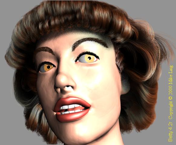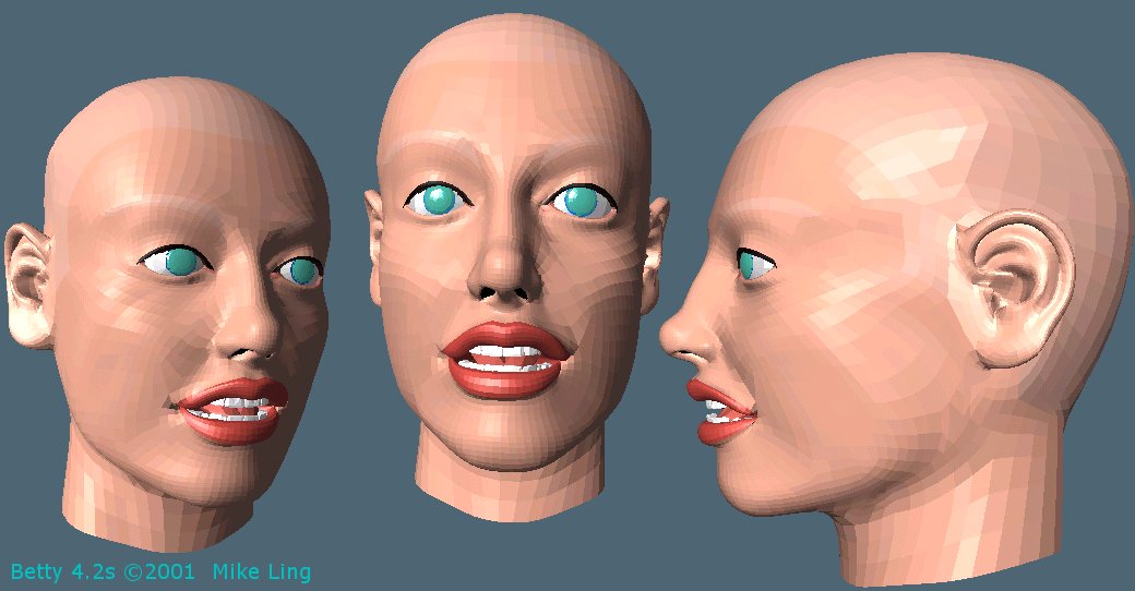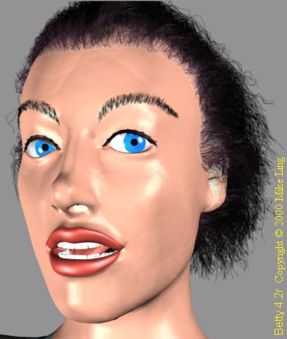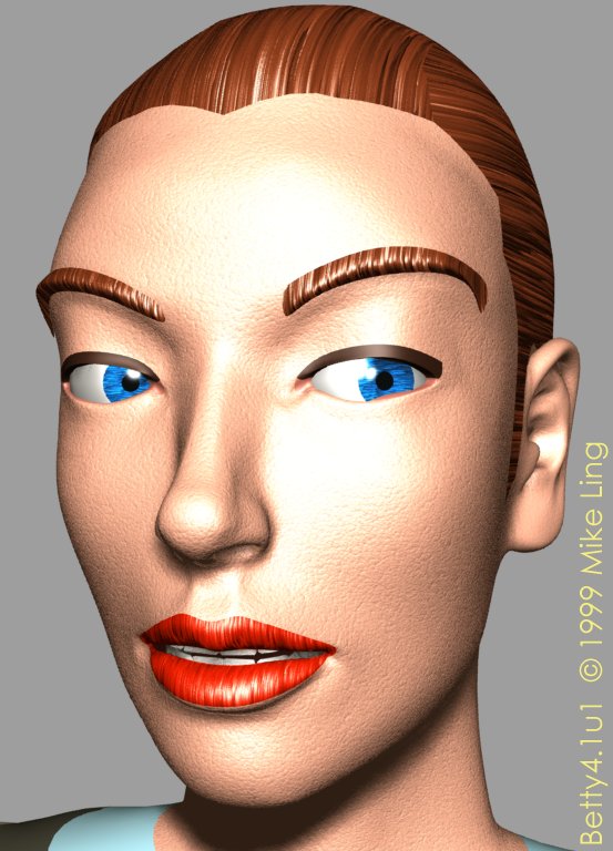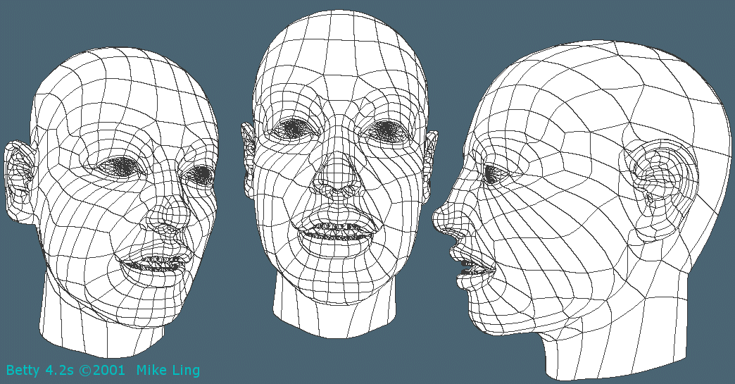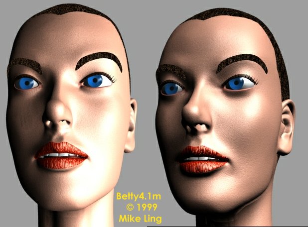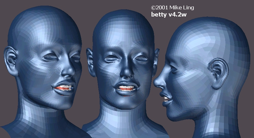 Version 4 Betty was built from a smooth shifting from a metaformed cube. Using the experience I had gained from making Betty v3 and various low poly modeling projects, I had begun designing a recipe for constructing heads. Benefits of this recipe are that the heads have a large amount of detail while being frugal polygon-wise. Prior to version 3, the heads were made from low poly-count spheres, which produced a lot of wasted polygons. Version 3 Betty was created as a low poly count head that also worked both as a metanurbs cage and standalone, but unfortunately. it did not seem ideal for making morph targets by merely moving a few polygons. Improvements introduced in